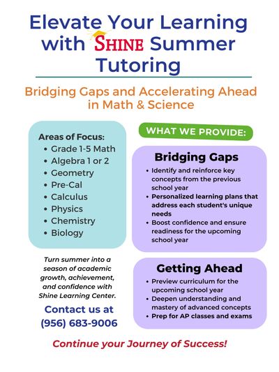 With our student-centric approach and dedicated educators, Shine Learning Center has been able to help numerous students in McAllen and across the Rio Grande Valley reach their academic goals and surpass them. We can't wait to do the same for your child.
